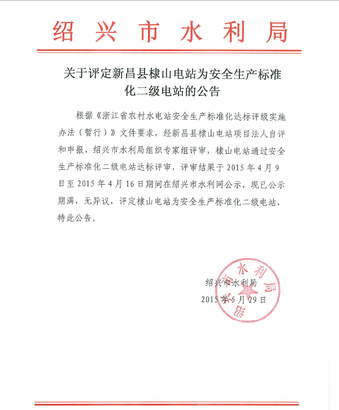 关于评定新昌县棣山电站为安全生产标准化二级电站的公告